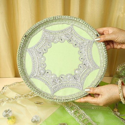 • A Decorated Thali with intricate designs, perfect for your Karwa Chauth puja
