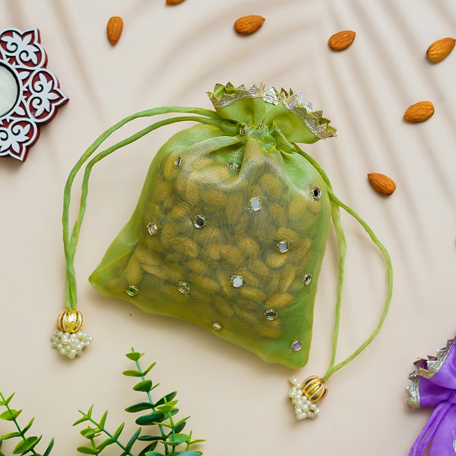 Elegant Organza Potli with Handmade Mirror Work – Perfect for Wedding & Festival Hampers